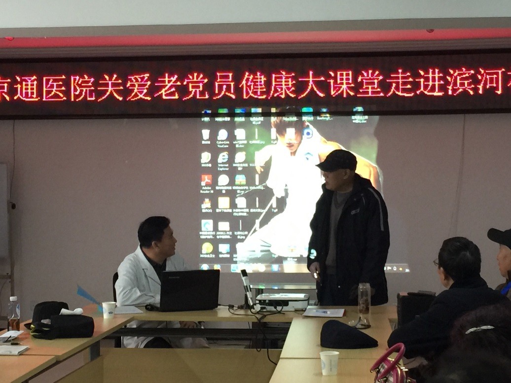 3月18日下午2点,北京京通医院内科主治医师初长友大夫携工作人员如约来到滨河社区,现场座无虚席,很多老党员们更是早早就到场等候。在工作人员布置会场的空隙时间里,便有老人根据自己的身体状况向初大夫咨询,初大夫一一耐心讲解。
